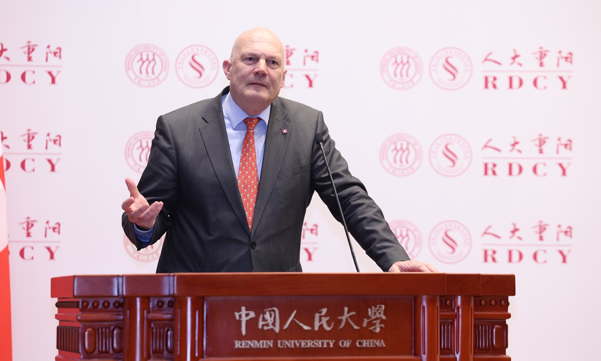 Swiss Ambassador to China Jürg Burri gives a speech at a forum in Renmin University of China on February 25, 2025. Photo: Courtesy of RDCY