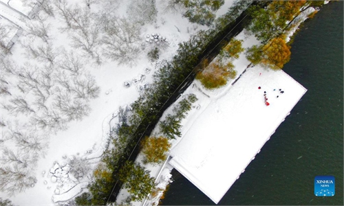 Cleaning staff in raincoat clear snow at the square of the Jinan West Railway Station in Jinan, East China Shandong Province on March 2, 2025. The city activated a red alert for blizzards after a maximum hourly snowfall of about 8 millimeters occurred in some regions. Photo: VCG