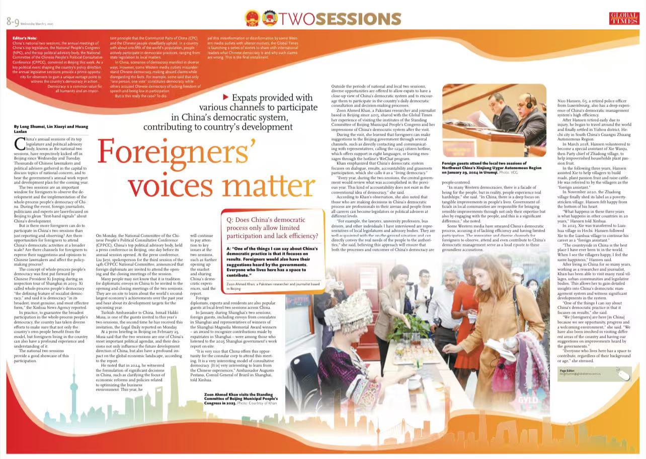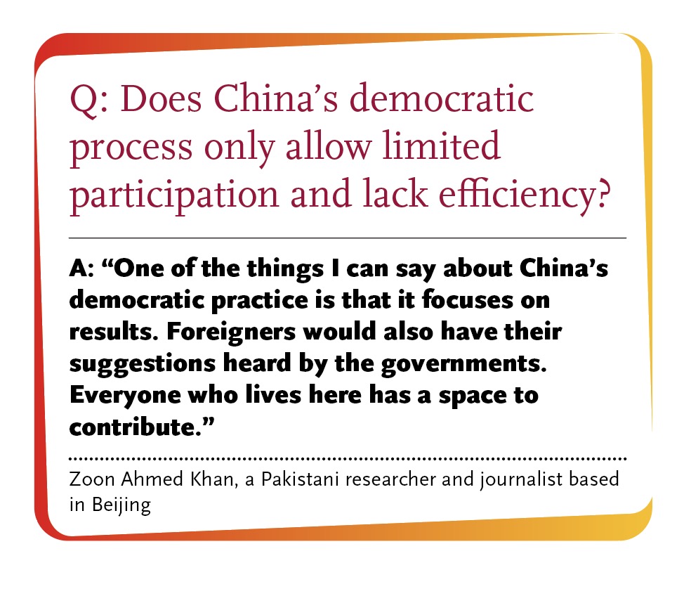 According to Khan's observation, she also noted that those who are making decisions in China's democratic process are professionals in their arenas and people from all careers can become legislators or political advisers at different levels.