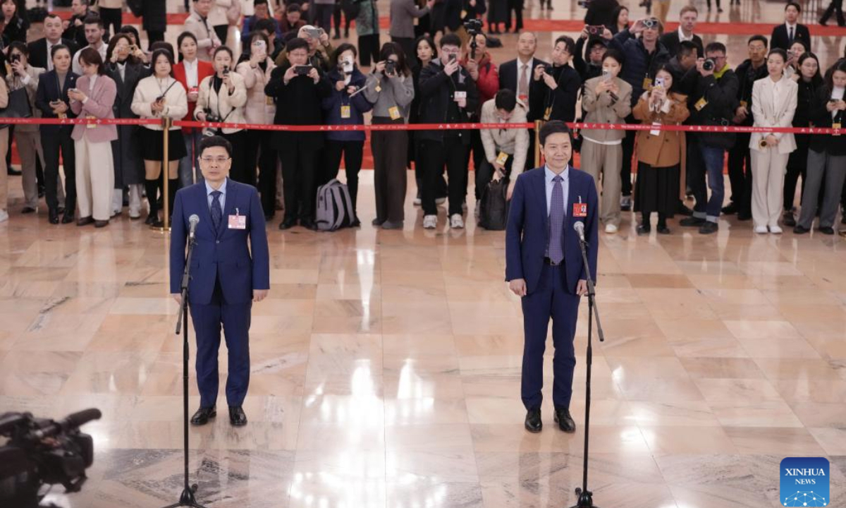 Lei Jun, a deputy to the 14th National People's Congress (NPC), attends a group interview ahead of the opening meeting of the third session of the 14th NPC at the Great Hall of the People in Beijing, capital of China, March 5, 2025. (Xinhua/Liu Dawei)