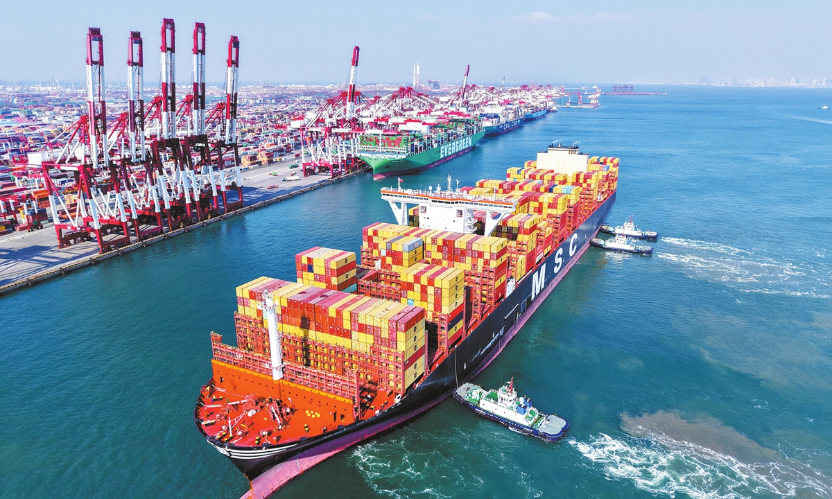 A cargo ship, assisted by tugboats, docks at the port of Qingdao in East China's Shandong Province on February 23, 2025. Photo: VCG