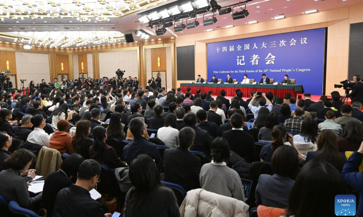 Journalists work at a press conference on people's livelihood for the third session of the 14th National People's Congress (NPC) in Beijing, capital of China, March 9, 2025. China's Minister of Civil Affairs Lu Zhiyuan, Minister of Human Resources and Social Security Wang Xiaoping, Minister of Housing and Urban-Rural Development Ni Hong, and head of the National Health Commission Lei Haichao attended the press conference on Sunday. (Xinhua/Xu Bingjie)