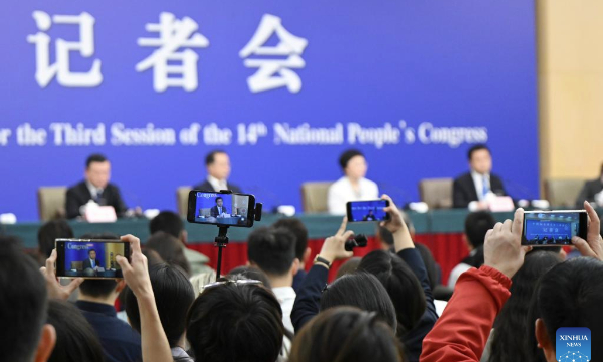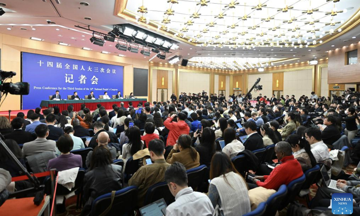 Journalists work at a press conference on people's livelihood for the third session of the 14th National People's Congress (NPC) in Beijing, capital of China, March 9, 2025. China's Minister of Civil Affairs Lu Zhiyuan, Minister of Human Resources and Social Security Wang Xiaoping, Minister of Housing and Urban-Rural Development Ni Hong, and head of the National Health Commission Lei Haichao attended the press conference on Sunday. (Xinhua/Xu Bingjie)