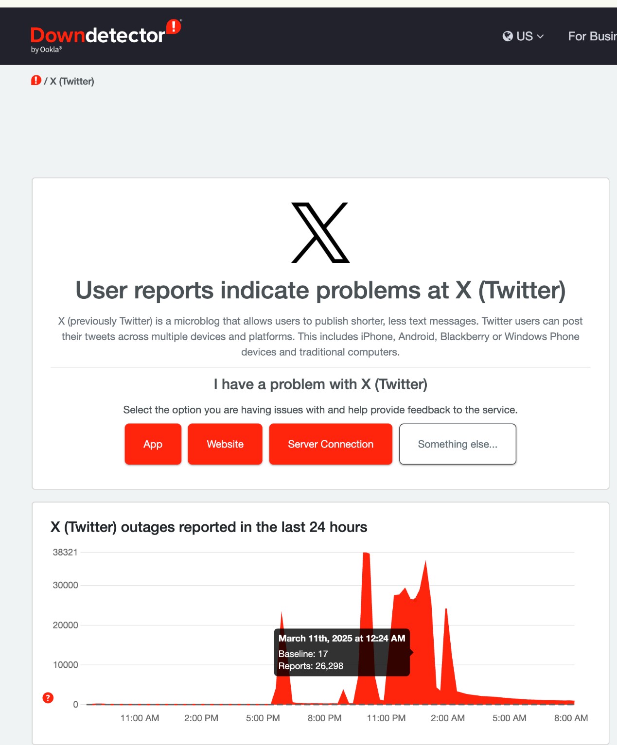 A screenshot shows user reports indicating problems at X (formerly Twitter), according to a release by Chinese cybersecurity firm Qi An Xin