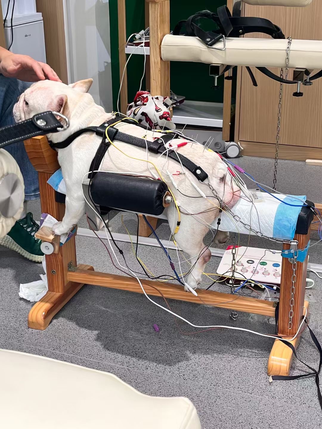 On a Friday afternoon in Chen's treatment room at the Chongfuxin international animal medicine center in Changping, Beijing, the Global Times observed Dou Dou's treatment. The canine was placed on a specialized treatment bed covered with grid cloth. His four legs were placed through the openings in the cloth to prevent him from moving. Chen used alcohol-soaked cotton swabs to disinfect some acupoints below the dog's waist and between the toes of the dog's paralyzed hind legs.
