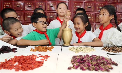 Elementary school students make traditional Chinese medicine (TCM) in a TCM pharmacy in Dongying, East China's Shandong Province, ...