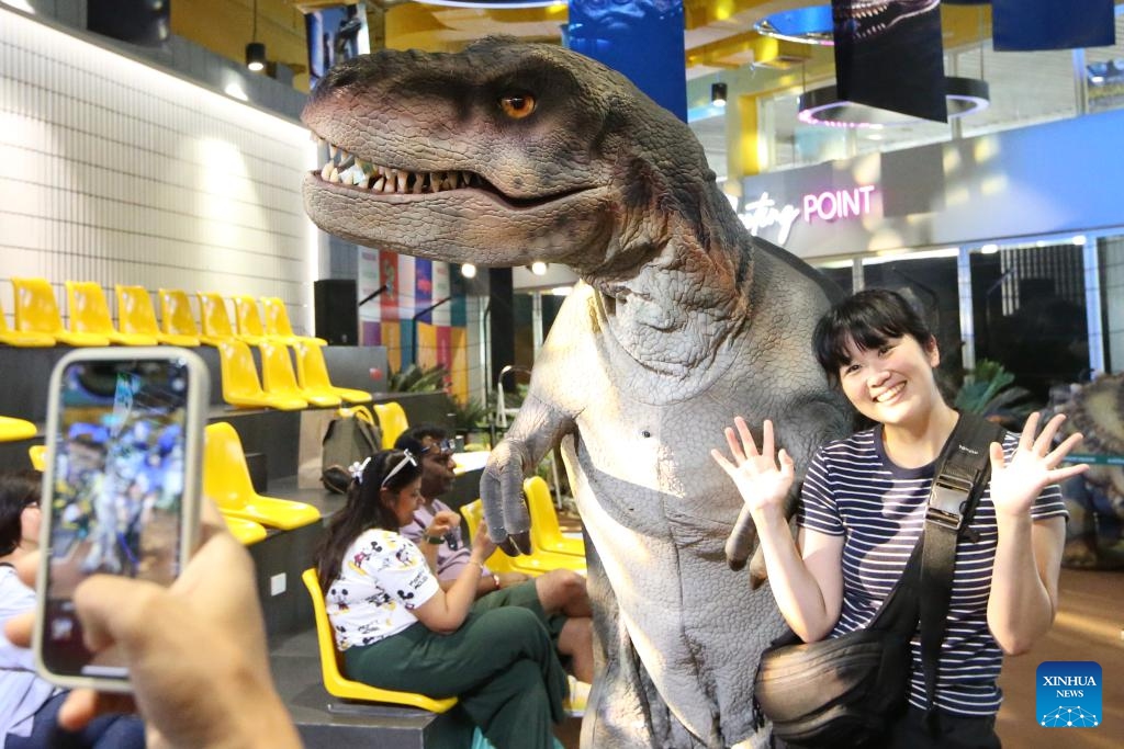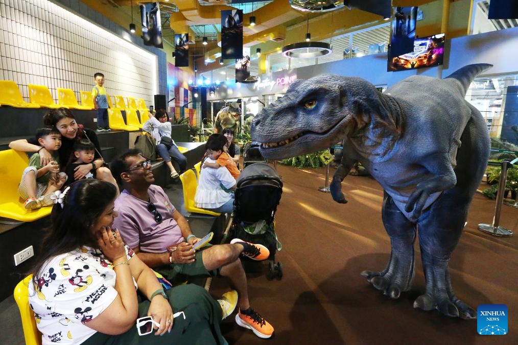 People visit a dinosaur exhibition in MBK center shopping mall in Bangkok, Thailand on March 18, 2025. The shopping mall held an exhibition to provide visitors with a glimpse of the age of the dinosaurs. (Photo: Xinhua)