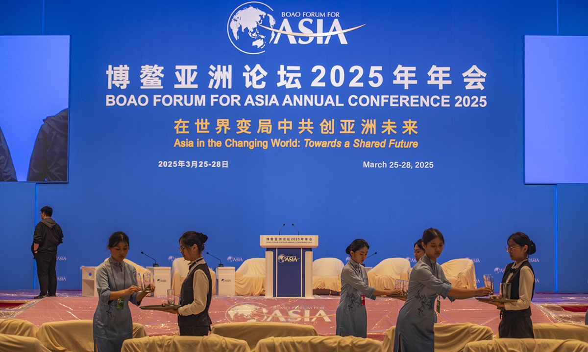 Staff members are preparing for reception for the Boao Forum for Asia (BFA) at the BFA International Conference Center in Qionghai, South China's Hainan Province on March 23, 2025. Photo: VCG