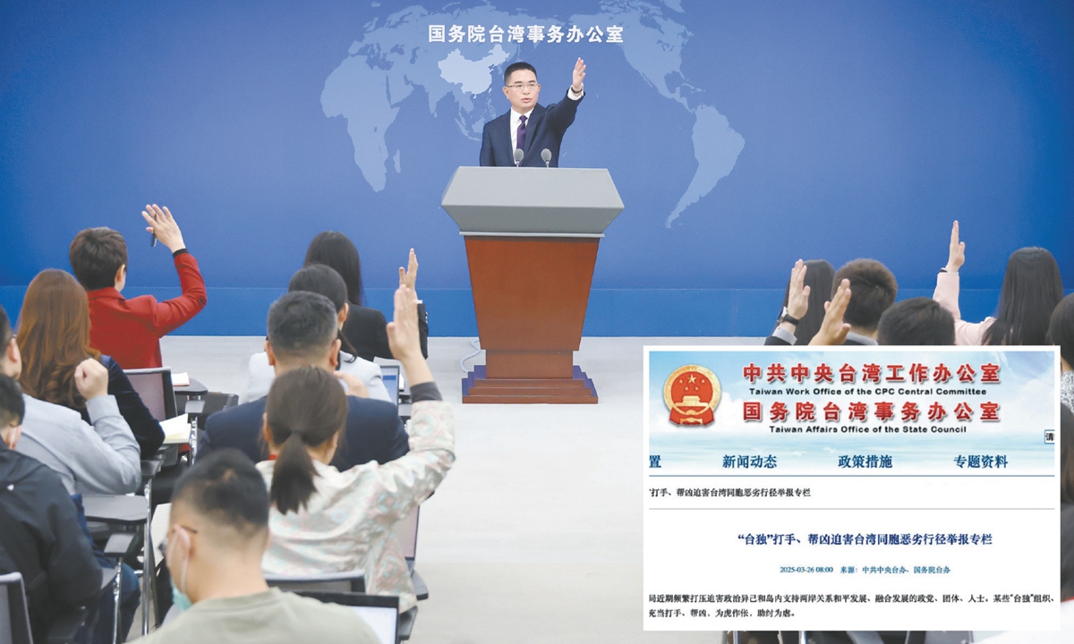 Chen Binhua, spokesperson of the Taiwan Affairs Office of the State Council, takes questions at a press conference in Beijing on March 26, 2025. Inset: Screenshot of an online platform for reporting the malicious acts of "Taiwan independence" henchmen and accomplices. Photos: VCG