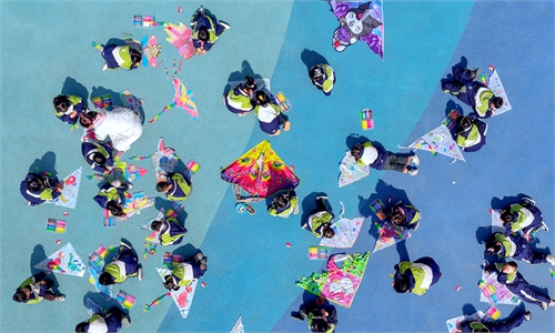 Children at the Third Experimental Kindergarten in Huaibei, East China's Anhui Province make printed eggs dyed with plants along with their teachers on March 26, 2025 to welcome the upcoming Qingming Festival, or Tomb-Sweeping Day, which falls on April 4. The Chinese folk belief is that eating an egg on Qingming Festival will bring good health all year round. Photo: VCG