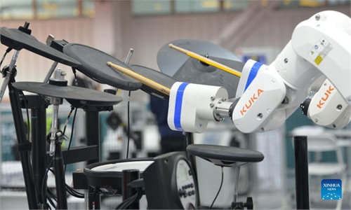 Guests interact with robot receptionists at the 2025 Zhongguancun Forum Annual Conference in Beijing on March 27, 2025. Photo: VCG