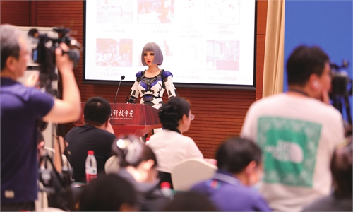 Robot “Xiao Qi” warms up a press conference for the 2023 World Robot Conference in Beijing on August ...