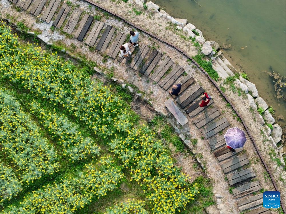 An aerial drone photo taken on March 27, 2025 shows tourists visiting the rapeseed flower field in Chating Town of Wangcheng District, Changsha City, central China's Hunan Province. In recent years, Chating Town has actively promoted the industrialization of rapeseed cultivation by planting over 10,000 mu (about 666.67 hectares) of rapeseed. Meanwhile, the town has organized various cultural and tourism activities featuring rapeseed flowers, with an aim of integrating local agriculture and culture into tourism for rural revitalization. (Photo: Xinhua)