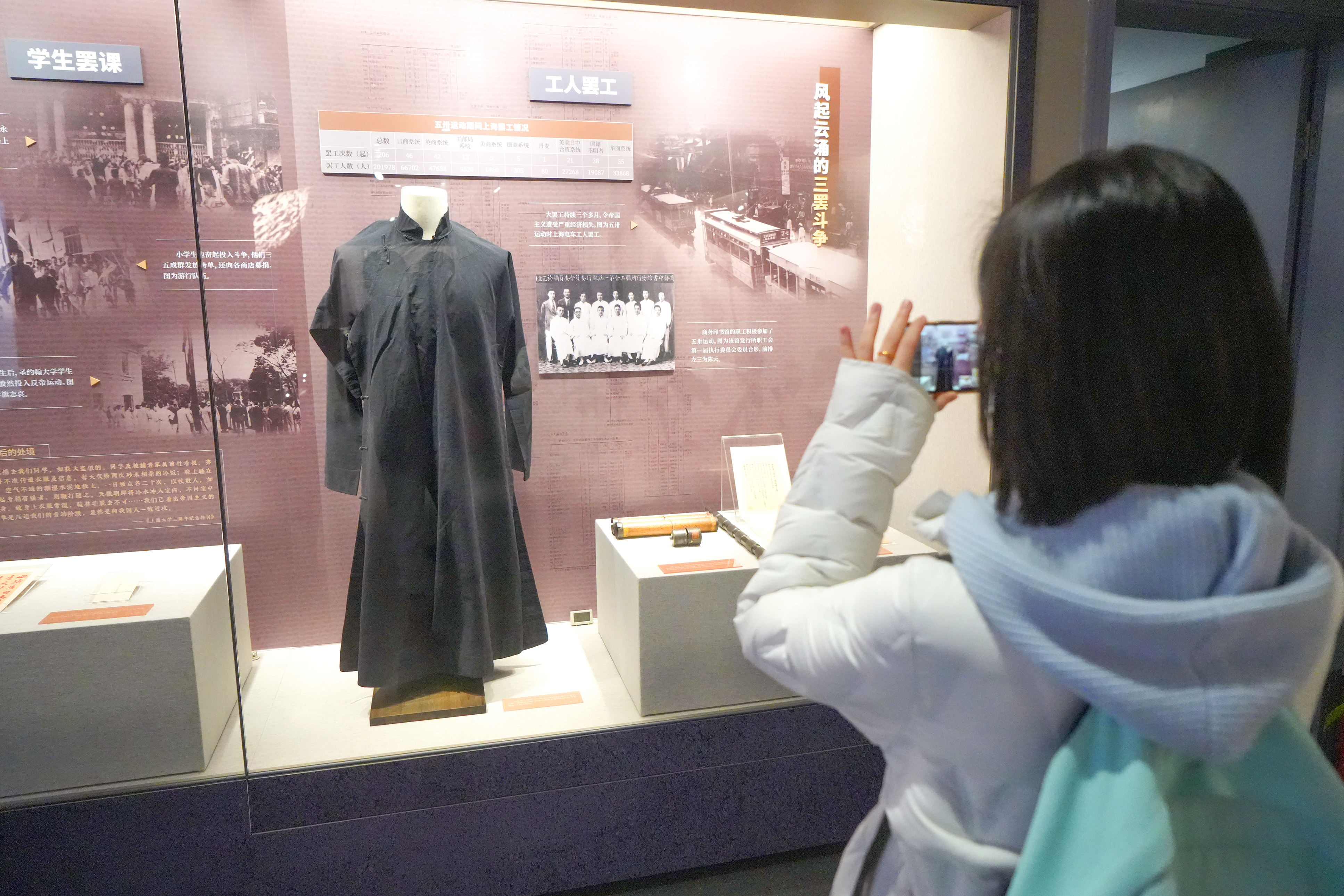 A visitor takes a photo at the exhibition “Hot Blood: Historical Artifacts and Archives Commemorating the 100th Anniversary of the May Thirtieth Movement,” on March 31, 2025. Photo: Lu Ting/GT