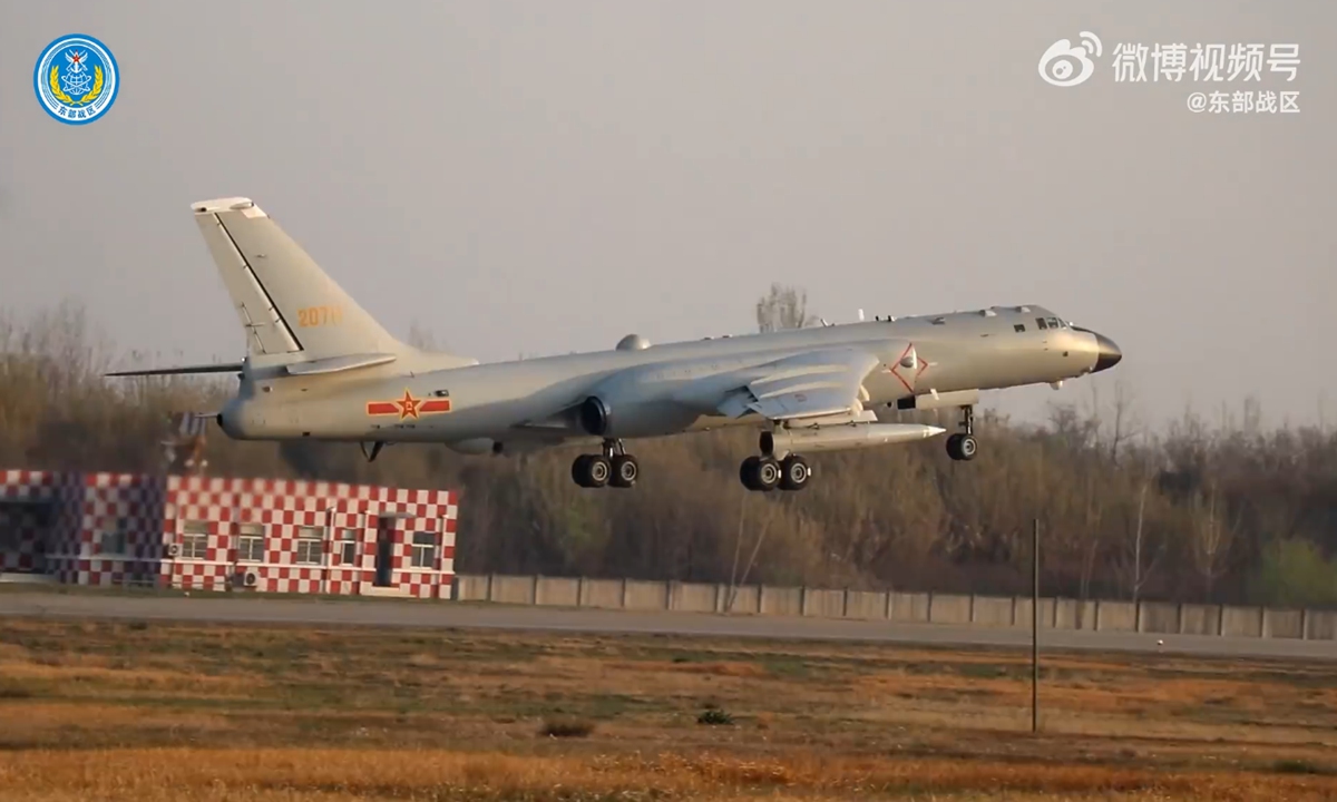 An H-6K bomber takes off during the joint exercises around Taiwan island on April 1, 2025. Senior Colonel Shi Yi, spokesperson of the Eastern Theater Command, says that on April 1, the PLA Eastern Theater Command starts to conduct joint exercises, organizing its army, navy, air and rocket forces to close in on the Taiwan Island from multiple directions.