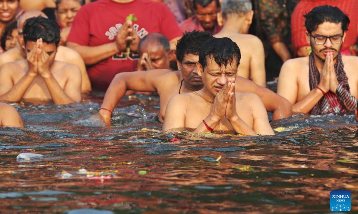 People take traditional holy bath at Brahmaputra river in Narayanganj, Bangladesh, April 5, 2025. Tens of thousands of pilgrims in Bangladesh have joined a traditional holy bath of Hindus at Brahmaputra river in Narayanganj. (Photo: Xinhua)