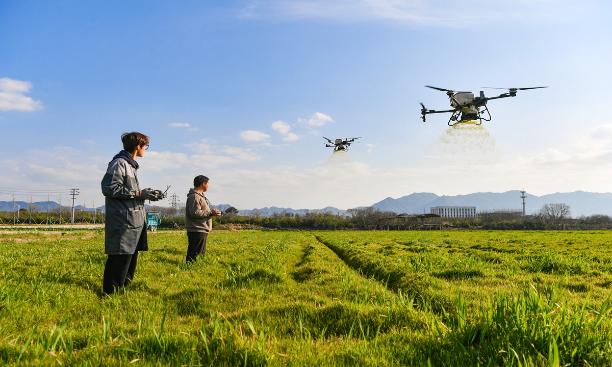 Tech-savvy farmer pilots maneuver crop-dusting drones over wheat fields in Jinhua, East China's Zhejiang Province, delivering precision fertilization during the pivotal spring jointing phase. File photo: VCG