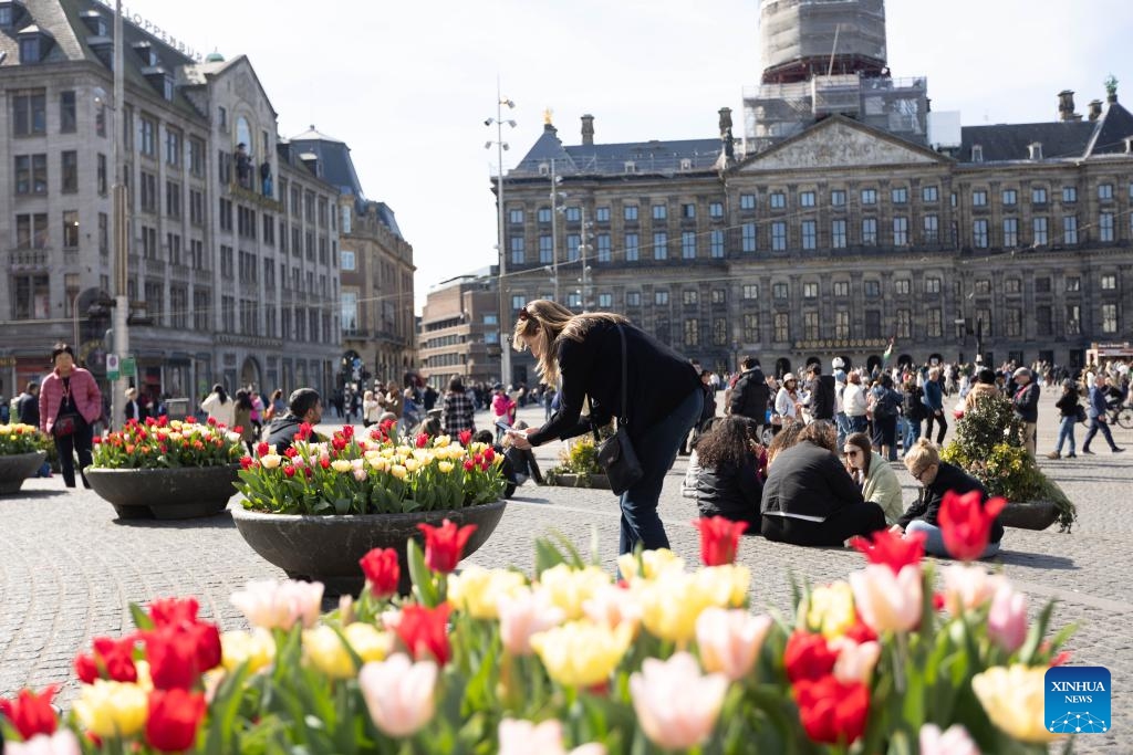 People enjoy sunshine and tulips in Amsterdam, the Netherlands, April 8, 2025. Tulips are displayed in more than 100 locations across Amsterdam during this year's tulip festival to celebrate the city's 750th anniversary. (Photo: Xinhua)