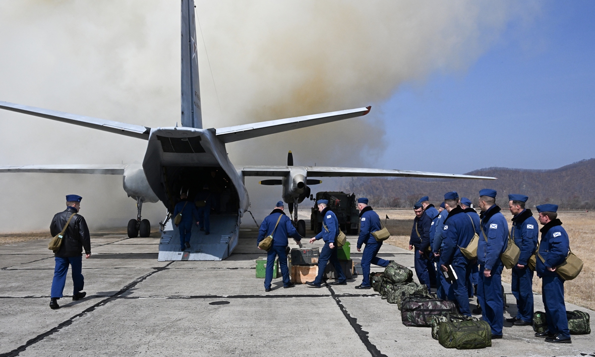 Russian servicemen board the Antonov An-26 transport aircraft during flight tactical exercises of the Russian Pacific fleet in Primorye Territory on April 10, 2025. Photo: VCG
