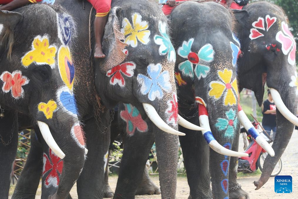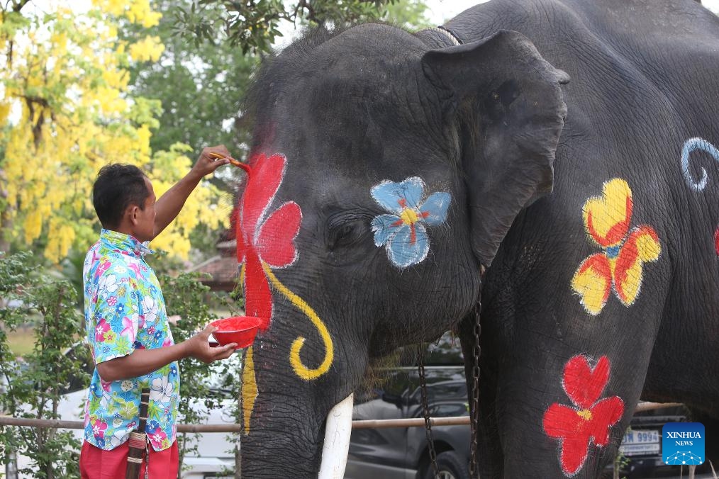 Elephants are painted in celebration of the upcoming Songkran festival in Ayutthaya, Thailand, April 10, 2025. The Songkran festival, the traditional Thai New Year, is celebrated from April 13 to 15 every year, during which people express greetings by splashing water on each other. (Photo: Xinhua)