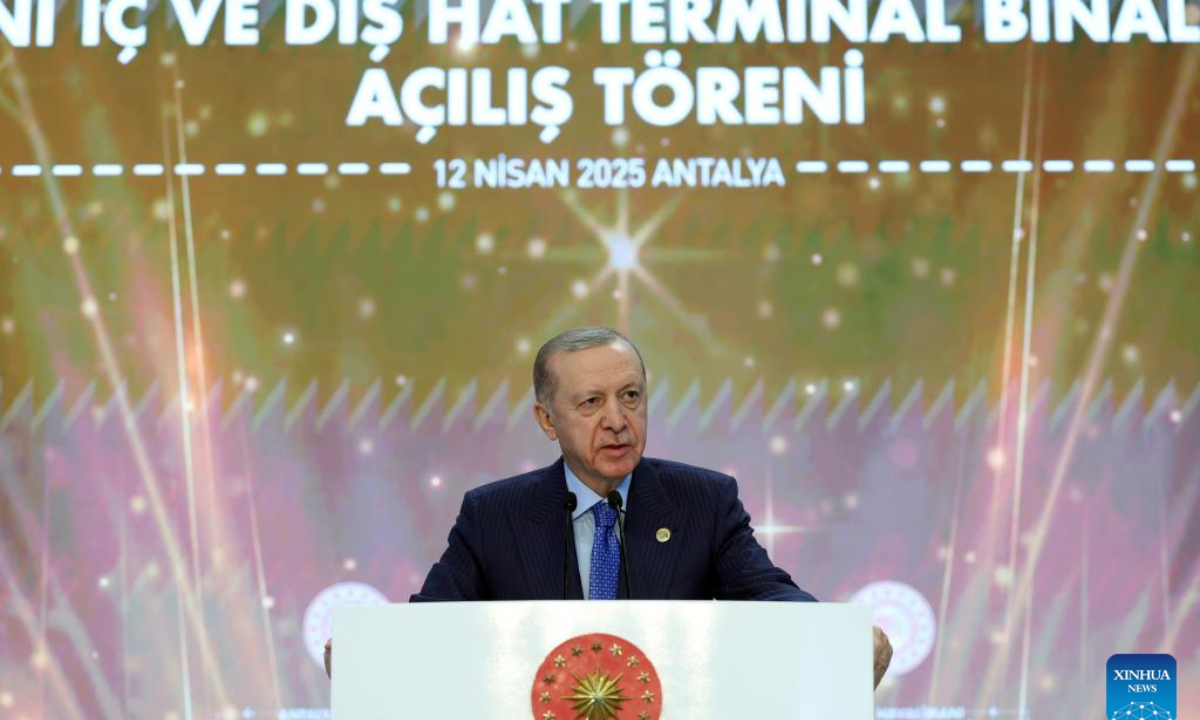 Turkish President Recep Tayyip Erdogan speaks during the inauguration ceremony of the newly expanded Antalya airport in Antalya, Türkiye, April 12, 2025. Turkish President Recep Tayyip Erdogan inaugurated the newly expanded Antalya airport on Saturday, announcing it can accommodate up to 82 million passengers annually. (Mustafa Kaya/Handout via Xinhua)