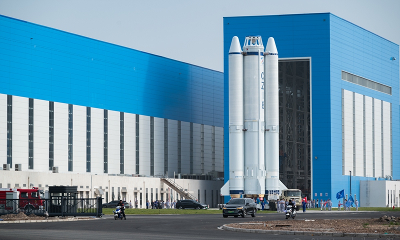 As launch preparations enter the final stage, the Long March-8 Y5 carrier rocket is transferred to the launch pad of the commercial space launch site on April 14, 2025 in Wenchang, South China's Hainan Province. Photo: VCG
