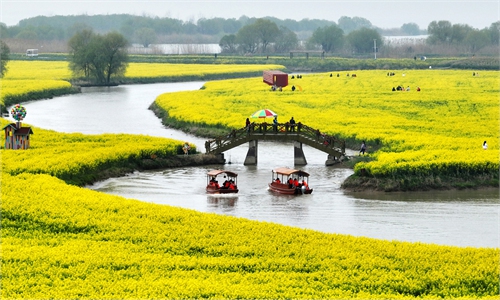 Tourists take boats through fields of rapeseed flowers on Gaoyou Lake in Yangzhou, East China's Jiangsu Province, on ...