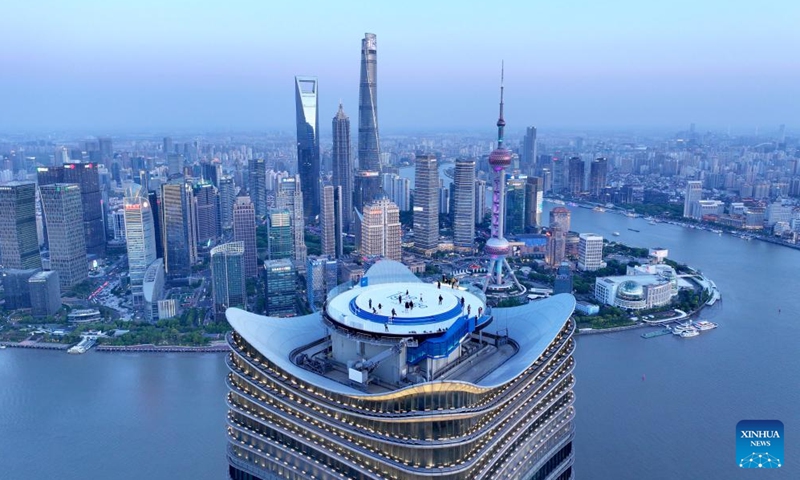 An aerial drone photo shows The Stage, a new observation deck atop White Magnolia Plaza in Shanghai, east China, April 14, 2025. The observation deck opened to the public on Tuesday, where visitors can get a 360-degree panoramic view of downtown Shanghai at 320 meters high. (Photo: Xinhua)