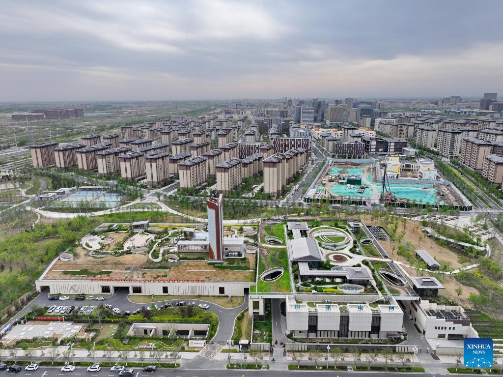 An aerial drone photo taken on April 15, 2025 shows an electrical substation in Xiong'an New Area, north China's Hebei Province. In recent years, the local power sector of Hebei has been promoting power grids construction of Xiong'an New Area in accordance with the standards of first-tier cities in China. Under the concept of green, innovative and smart development, the construction of electrical substations would be integrated with urban landscape design, and many intelligent power projects have been finished. (Photo: Xinhua)