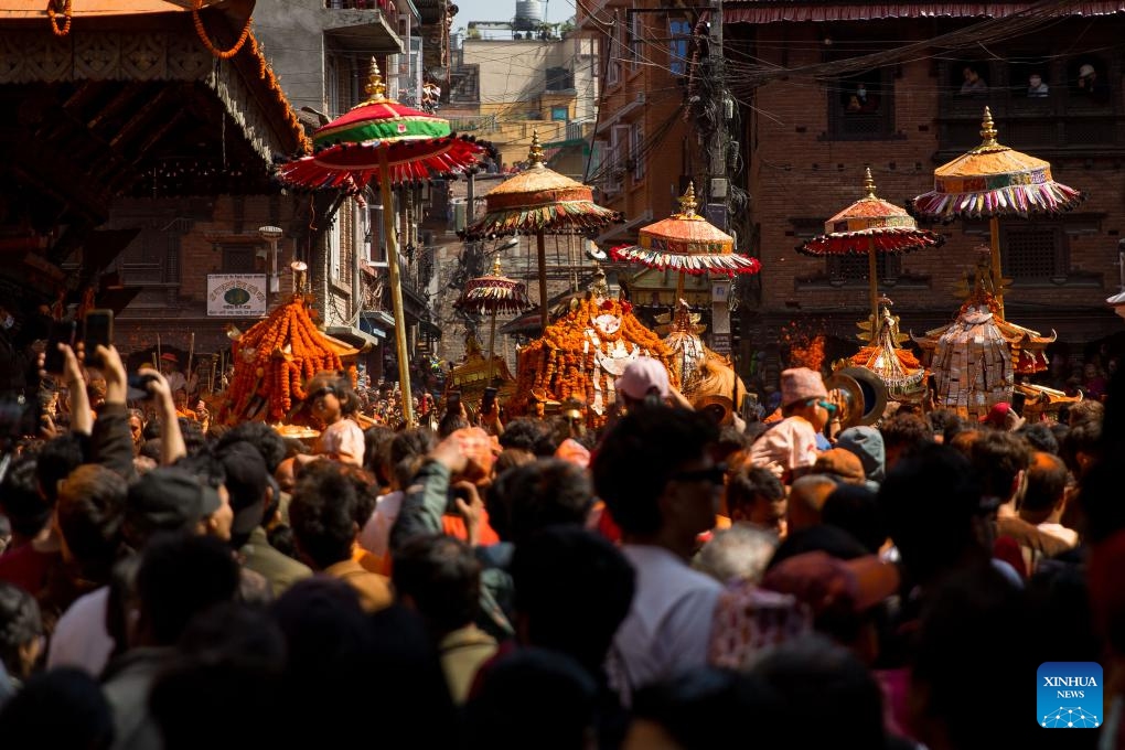 People celebrate the Sindoor Jatra Festival in Bhaktapur, Nepal, April 15, 2025. The festival is celebrated to welcome the Nepalese New Year and the beginning of the spring season in Nepal. (Photo: Xinhua)