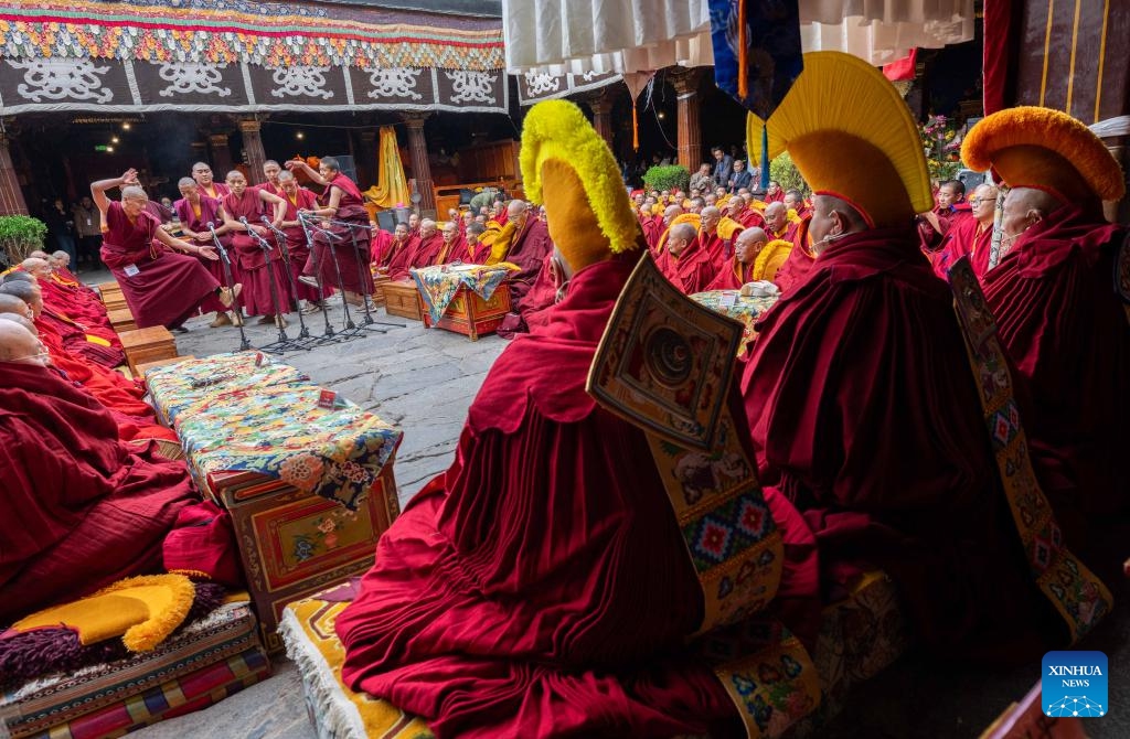 Monks attend a debate and award ceremony conferring the title of Geshe Lharampa at the Jokhang Temple in Lhasa, capital of southwest China's Xizang Autonomous Region, April 15, 2025. Thirteen monks obtained the degree of Geshe Lharampa, the highest academic degree in the exoteric teachings of the Gelug school of Tibetan Buddhism, here on Tuesday. Geshe Lharampa, which means "intellectual" in the Tibetan language, is the equivalent of a doctoral degree in modern education. (Photo: Xinhua)