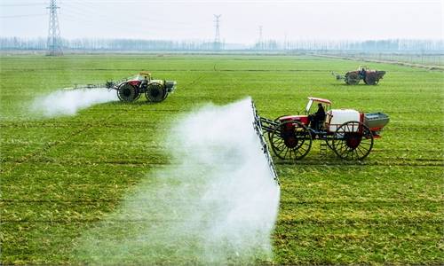 A drone team from a vocational college carries out aerial spraying operations in wheat fields in Suqian, East China's Jiangsu Province on April 16. 2025. In 2024, China's plant protection drone fleet has reached 251,000 units, according to media reports. Photo: VCG
