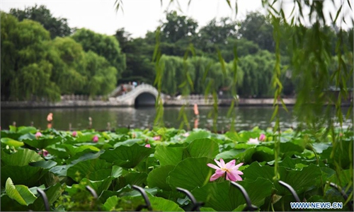 Photo taken on July 3, 2020 shows lotus flowers after a rainfall at Daming Lake scenic spot in ...