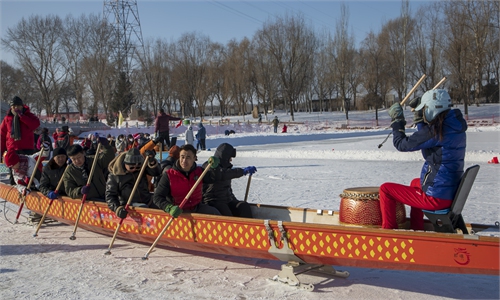 Competitors practice for an ice dragon boat race on February 2, 2023 in Jilin, Northeast China’s Jilin Province. ...