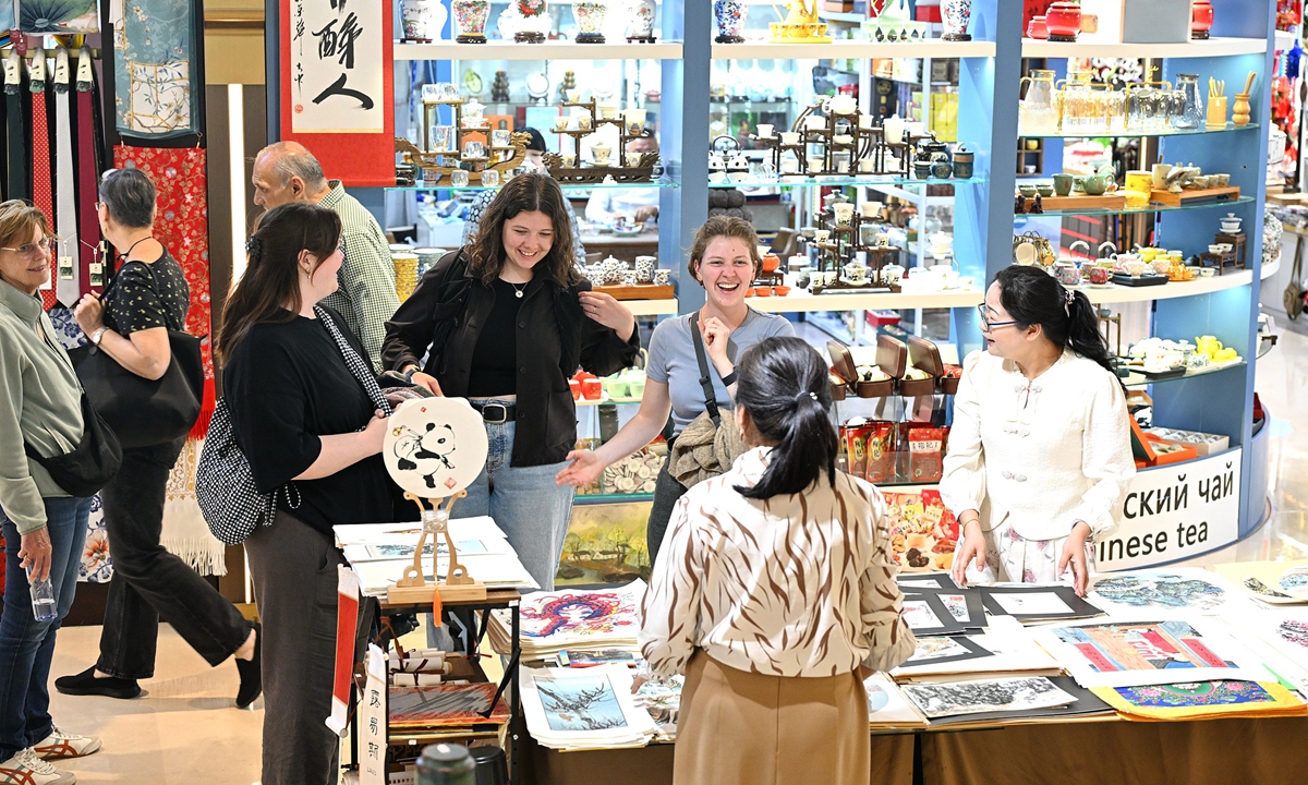 Foreign tourists shop at the Silk Street Market in Beijing on April 20, 2025. Photo:VCG