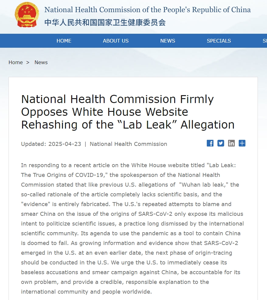 In responding to a recent article on the White House website titled "Lab Leak: The True Origins of COVID-19," the spokesperson of China's National Health Commission stated that like previous U.S. allegations of "Wuhan lab leak," the so-called rationale of the article completely lacks scientific basis, and the "evidence" is entirely fabricated.