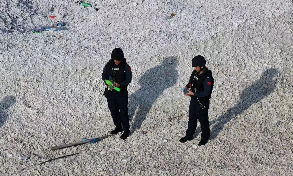 The Global Times learned from a source close to the matter that a group of CCG officers landed on Tiexian Jiao to conduct on-reef inspection and video-recording of illegal activity. Meanwhile, the CCG officers also displayed the Chinese national flag to assert sovereignty, cleaned up plastic bottles, wooden sticks, and other debris scattered across the reef flat.