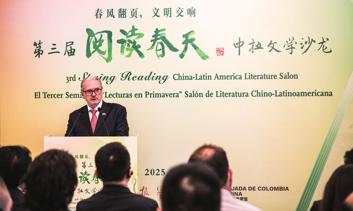 Sergio Fausto Cabrera Cárdenas, ambassador of Colombia to China speaks at the "Spring Reading" - China-Latin America Literature Salon at the hall of the embassy in Beijing on April 22, 2025. Photo: Chen Tao/GT