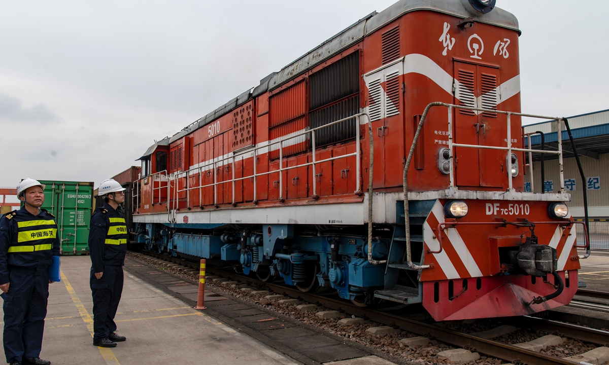 A China-Europe freight train loaded with 100 standard containers of goods departs from a railway station in Jinhua, East China's Zhejiang Province, on March 31, 2025. Photo: cnsphoto