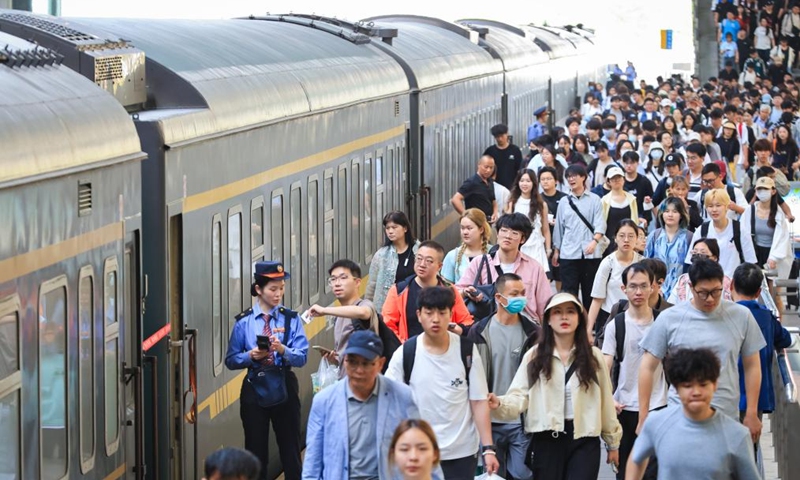 Passengers prepare to board a train at Hankou Railway Station in Wuhan, central China's Hubei Province, May 1, 2025. The transportation network of the country witnessed a travel peak on the first day of the May Day holiday. (Xinhua/Wu Zhizun)