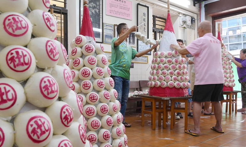 Photo taken on April 30, 2025 shows people preparing for the upcoming Cheung Chau Bun Festival in May in Hong Kong, south China. (Xinhua/Chen Duo)
