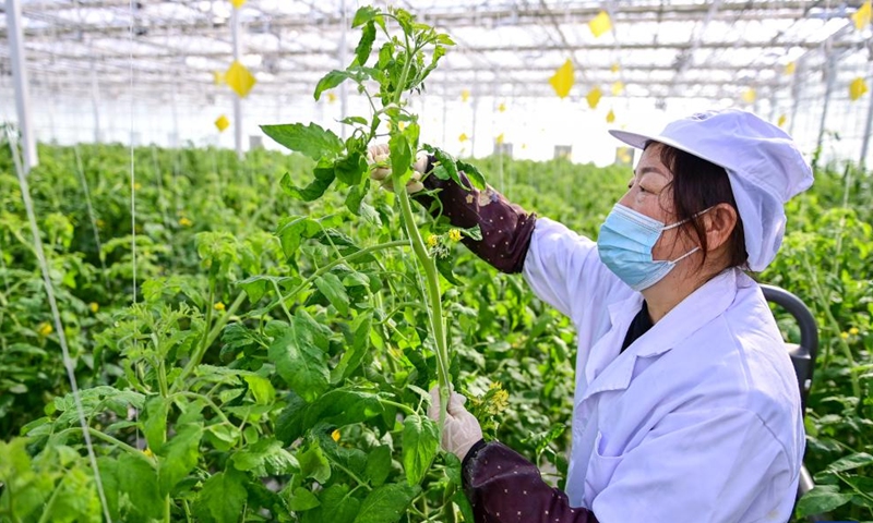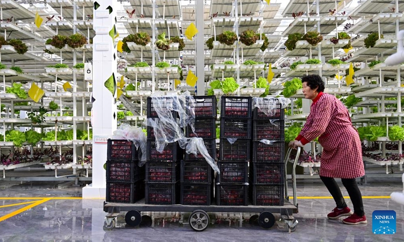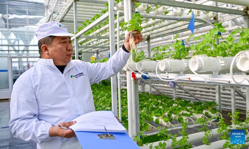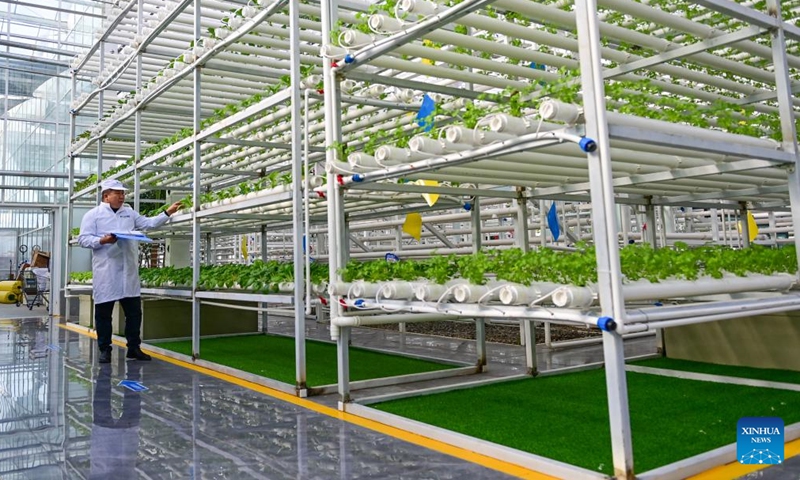 Senior agronomist Yan Ji checks the growth of vegetables at the center for future agricultural science and technology of an agricultural demonstration zone in Changji Hui Autonomous Prefecture, northwest China's Xinjiang Uygur Autonomous Region, Feb. 10, 2025. (Photo: Xinhua)