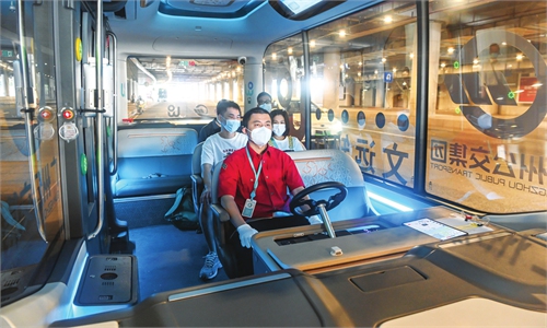 An autonomous driving minibus runs on a road in Yuhang District, Hangzhou City, east China's Zhejiang Province, May 22, 2024. The autonomous driving bus route in Yuhang District is the first one of its kind powered by vehicle-road coordination technology in Hangzhou. This 5-kilometer bus line winds through schools, industrial parks, residential compounds and subway stations, free of charge for all citizens.(Photo: Xinhua)