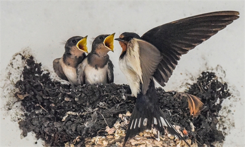 Mother swallow feeds its babies in a nest under the eaves in Nanning, South China’s Guangxi Zhuang Autonomous ...