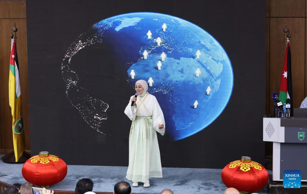A contestant gives her talent performance during the final of the 24th edition of the "Chinese Bridge" Chinese Proficiency Competition for Foreign College Students in Jordan in Amman, Jordan, on May 14, 2025. The 24th edition of the "Chinese Bridge" Chinese Proficiency Competition for Foreign College Students in Jordan selected the country's champion on Wednesday to represent the country at the global finals, to be held in Beijing later this year. (Photo by Mohammad Abu Ghosh/Xinhua)
