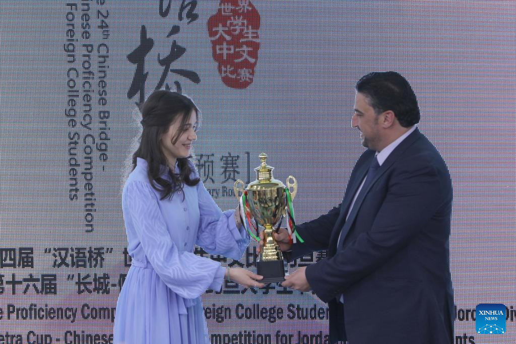 Marwan Al-Jarrah (R), dean of the School of Foreign Languages at the University of Jordan, presents the award to the second-place winner for the final of the 24th edition of the "Chinese Bridge" Chinese Proficiency Competition for Foreign College Students in Jordan in Amman, Jordan, on May 14, 2025. The 24th edition of the "Chinese Bridge" Chinese Proficiency Competition for Foreign College Students in Jordan selected the country's champion on Wednesday to represent the country at the global finals, to be held in Beijing later this year. (Photo by Mohammad Abu Ghosh/Xinhua)