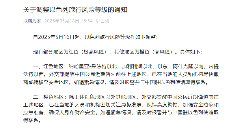 The Chinese Embassy in Israel issued a notice on Sunday saying that, effective May 16, 2025, Israel's travel risk levels have been adjusted, with some areas designated as red (extremely high risk) and others as orange (high risk).