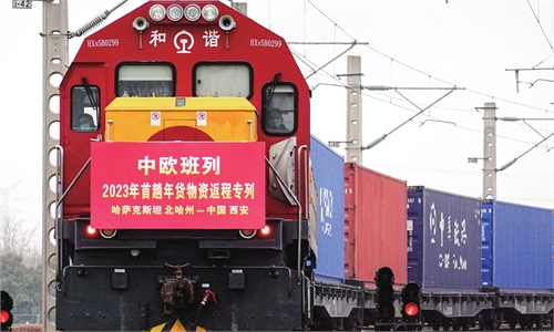 A China-Europe freight train loaded with containers prepares to depart from a logistics base in Lianyungang, East China's Jiangsu Province, on May 22, 2025. Official data showed that 1,792 China-Europe freight trains operated across China in April, a 9 percent year-on-year increase. Photo: VCG
