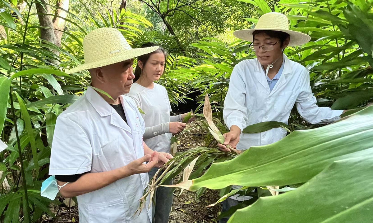 Zhang Yongyu (left) and a young teacher (right) teach a student about herbal medicine in Xishuangbanna Dai Autonomous Prefecture in Southwest China's Yunnan Province. Photo: Courtesy of Zhang Yongyu
