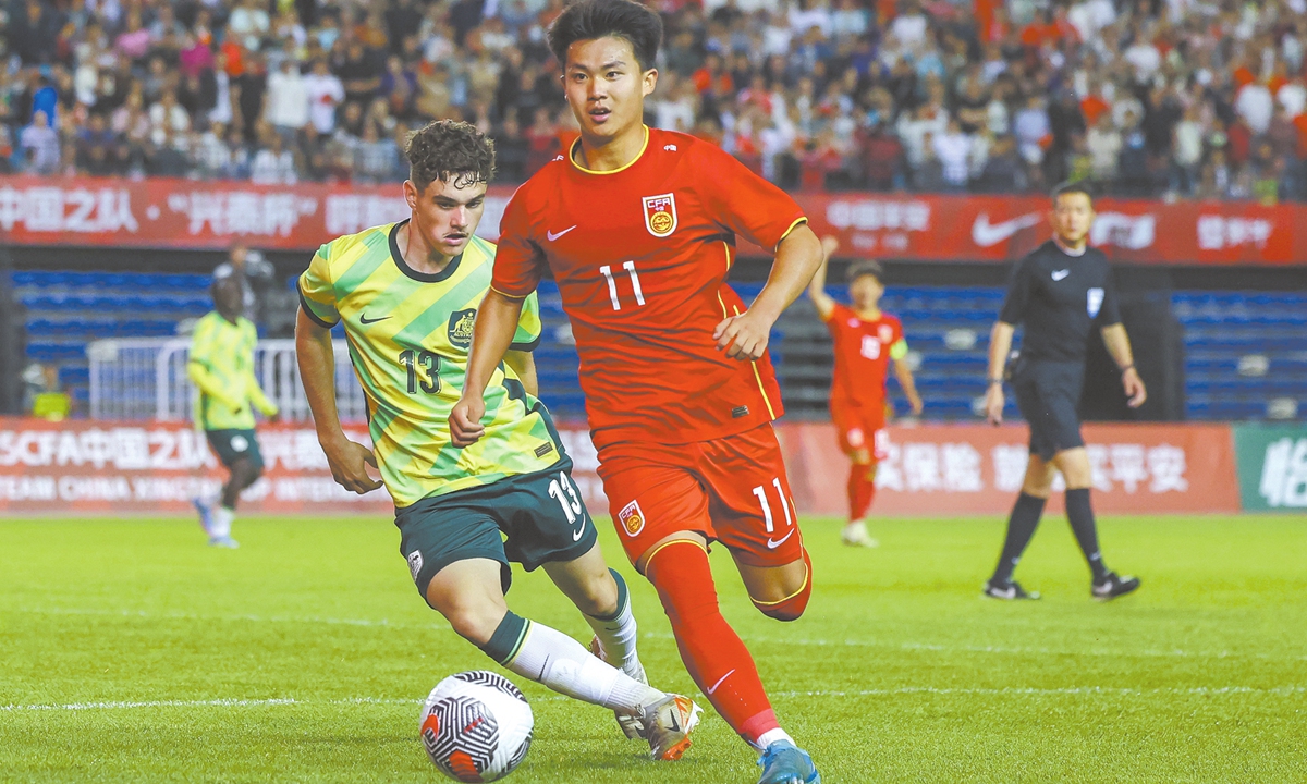 Chinese striker Liang Shiyu dribbles the ball during the match between China and Australia on June 1. Photo: VCG